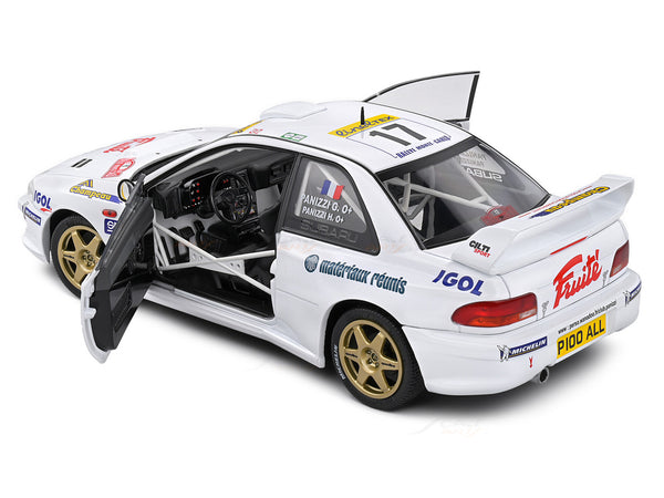 Finished in the iconic Subaru blue with rally decals, this Solido 1:18 model showcases authentic event detailing including sponsor graphics, competition number #17, aerodynamic bodywork, rally lights, and a roll-cage-equipped interior.